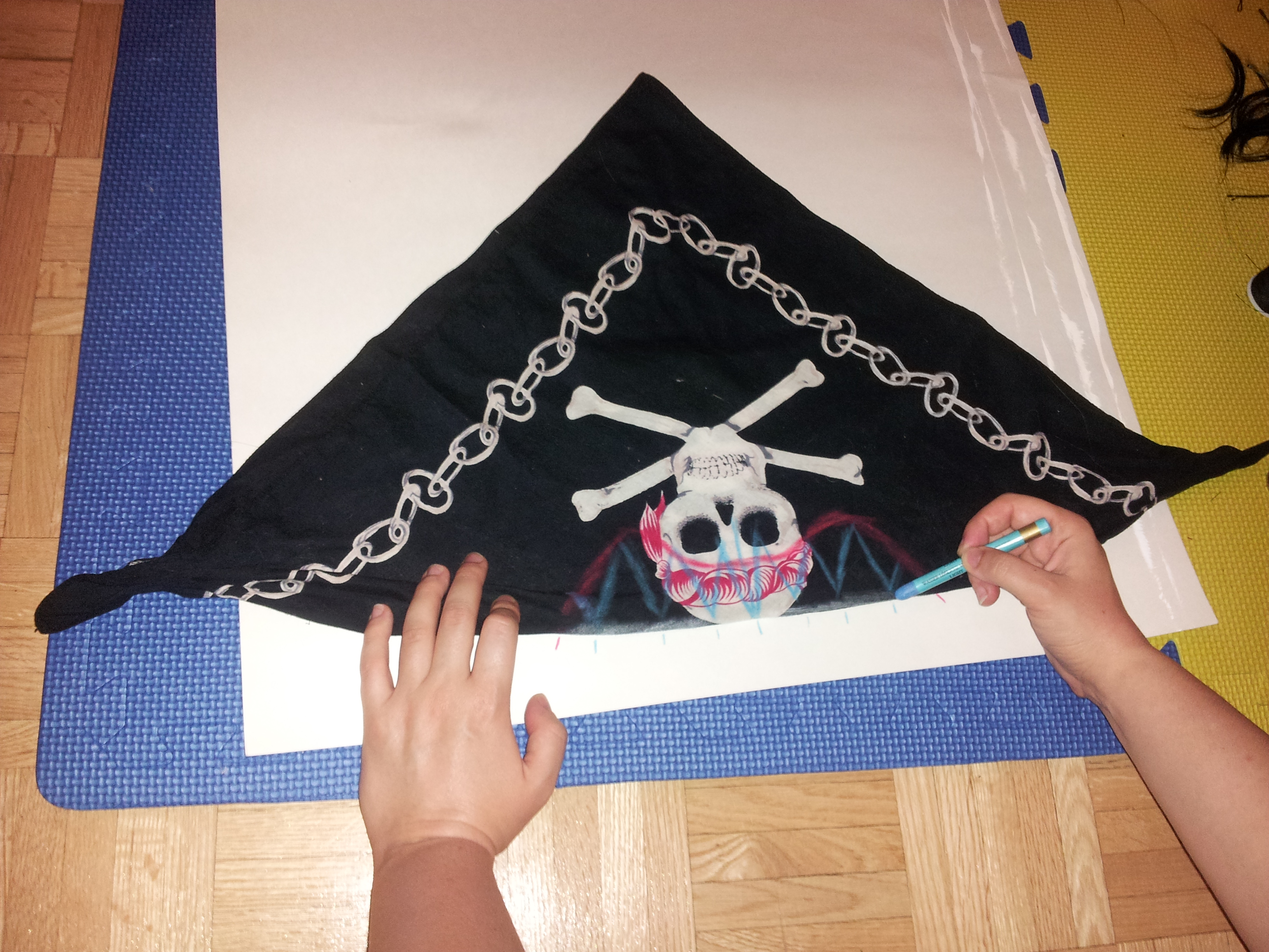 - A dark-coloured bandana and a couple different colours of chalk to draw on it.
