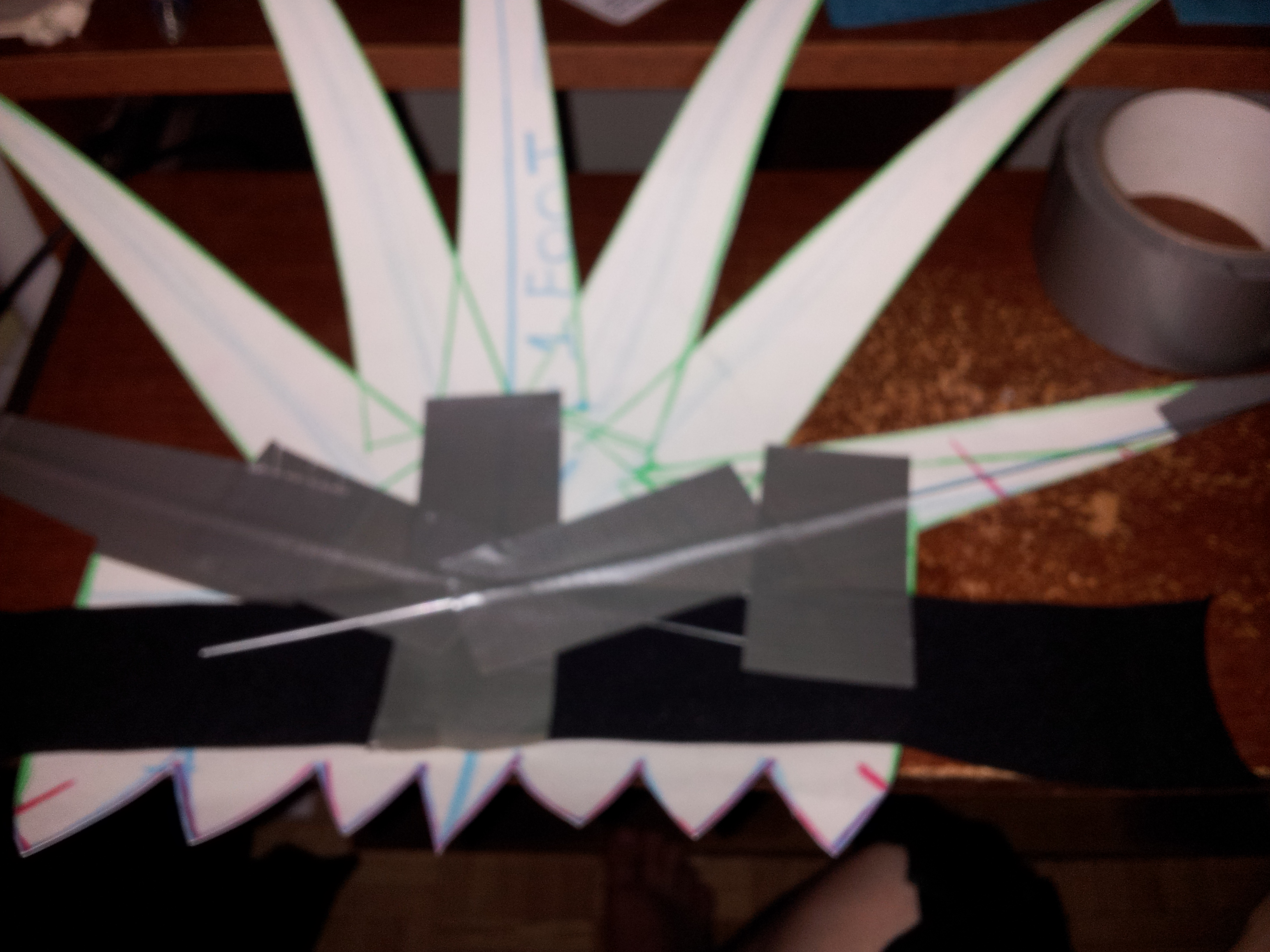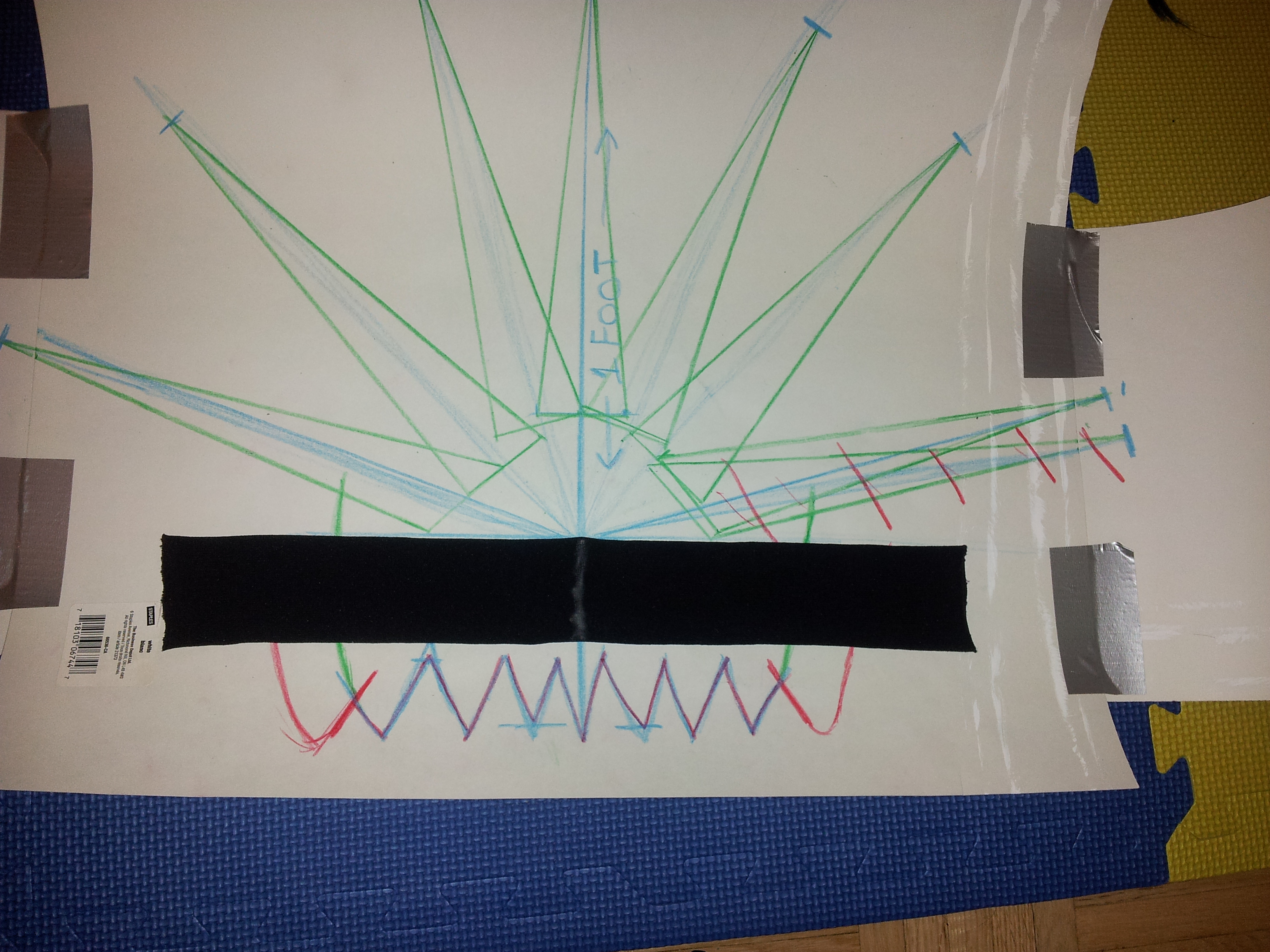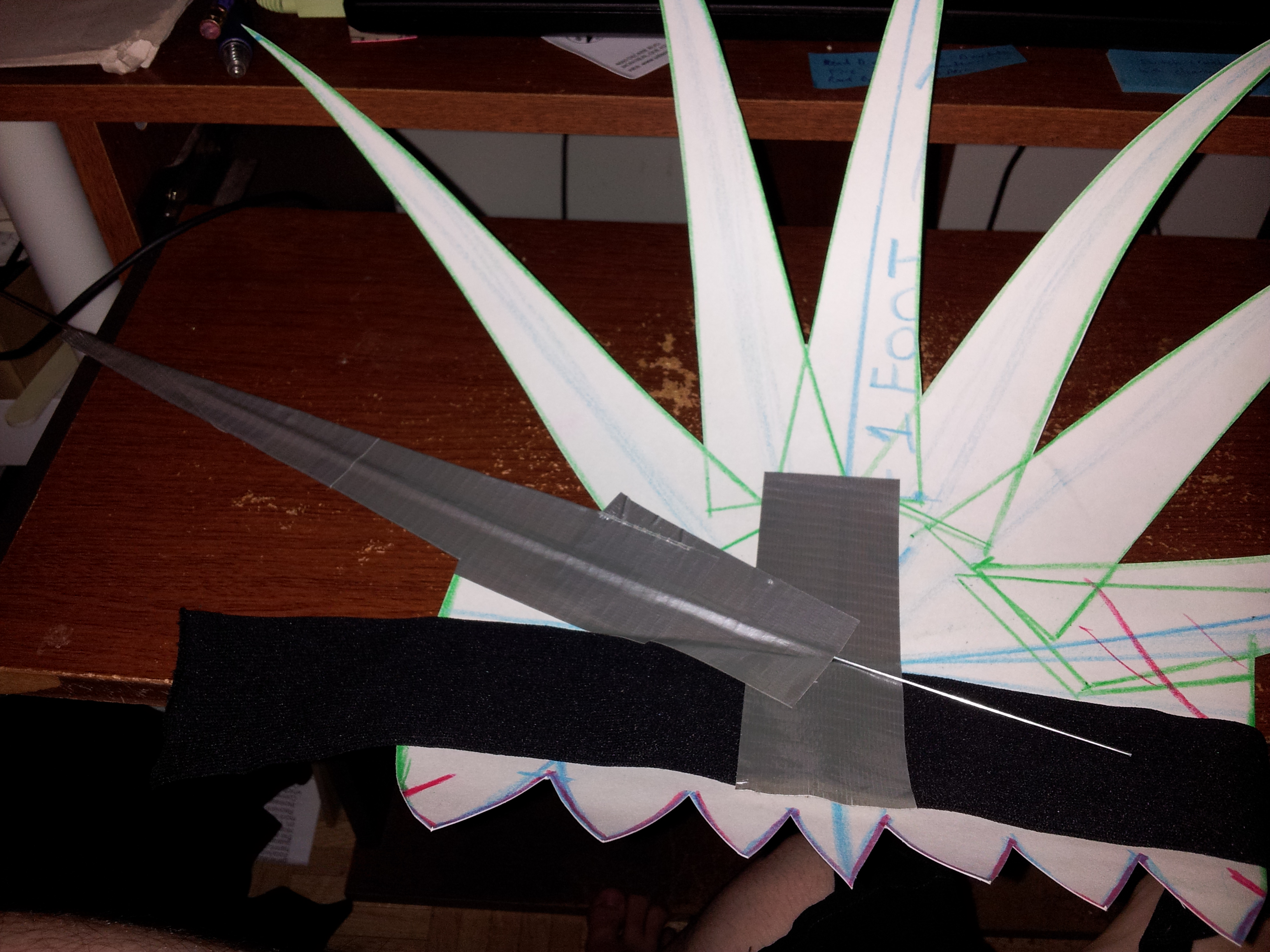 Now we find the seam in the stretchy headband and cut it there. Spread it out on your bristol board and line it up with where Kenpachi’s hairline goes back the deepest. Draw ONLY 7 of the hair spikes onto the bristol board. The other four spikes will be made with a second wig because they come from behind Kenpachi’s ears and point somewhat downward.