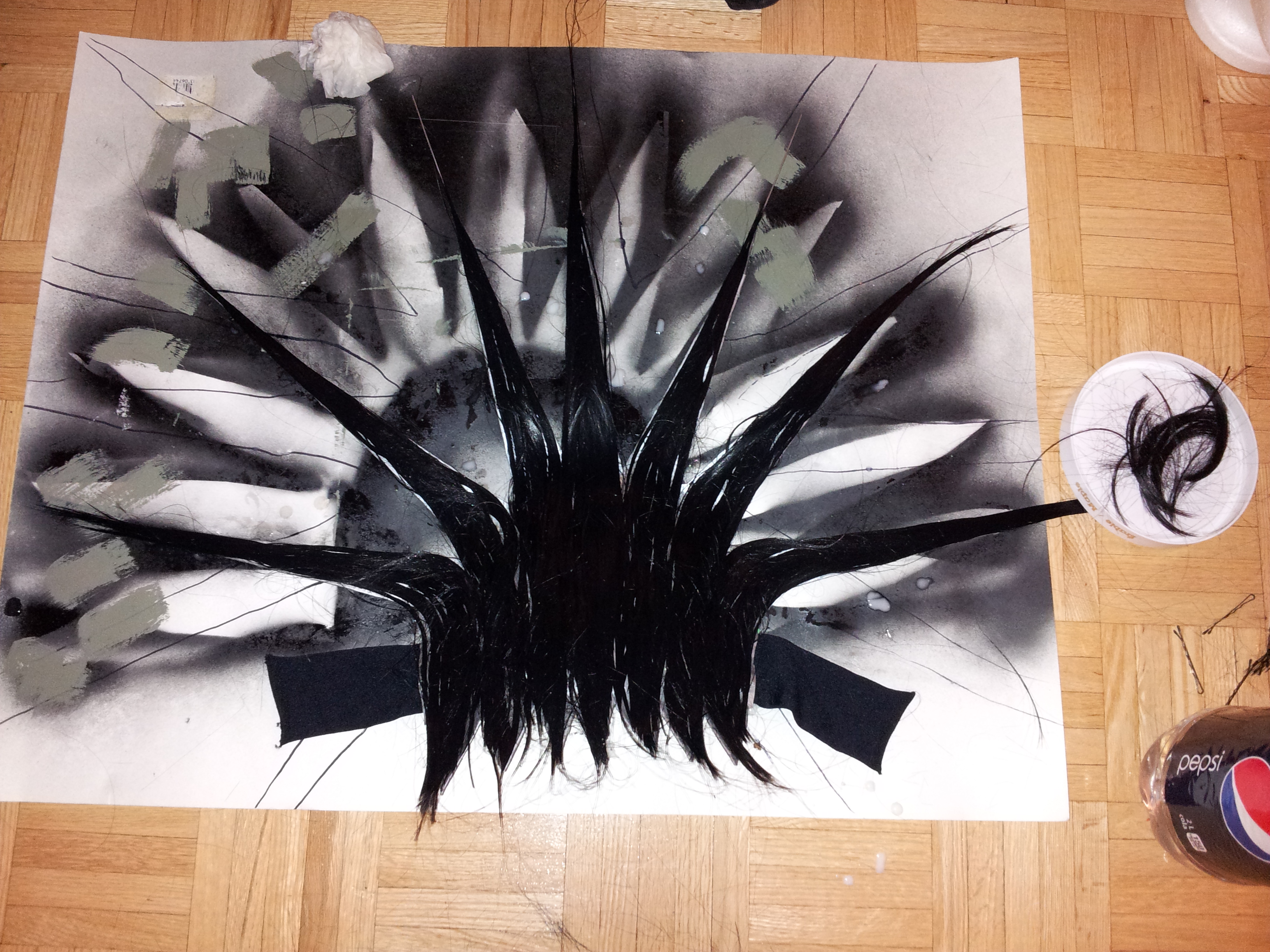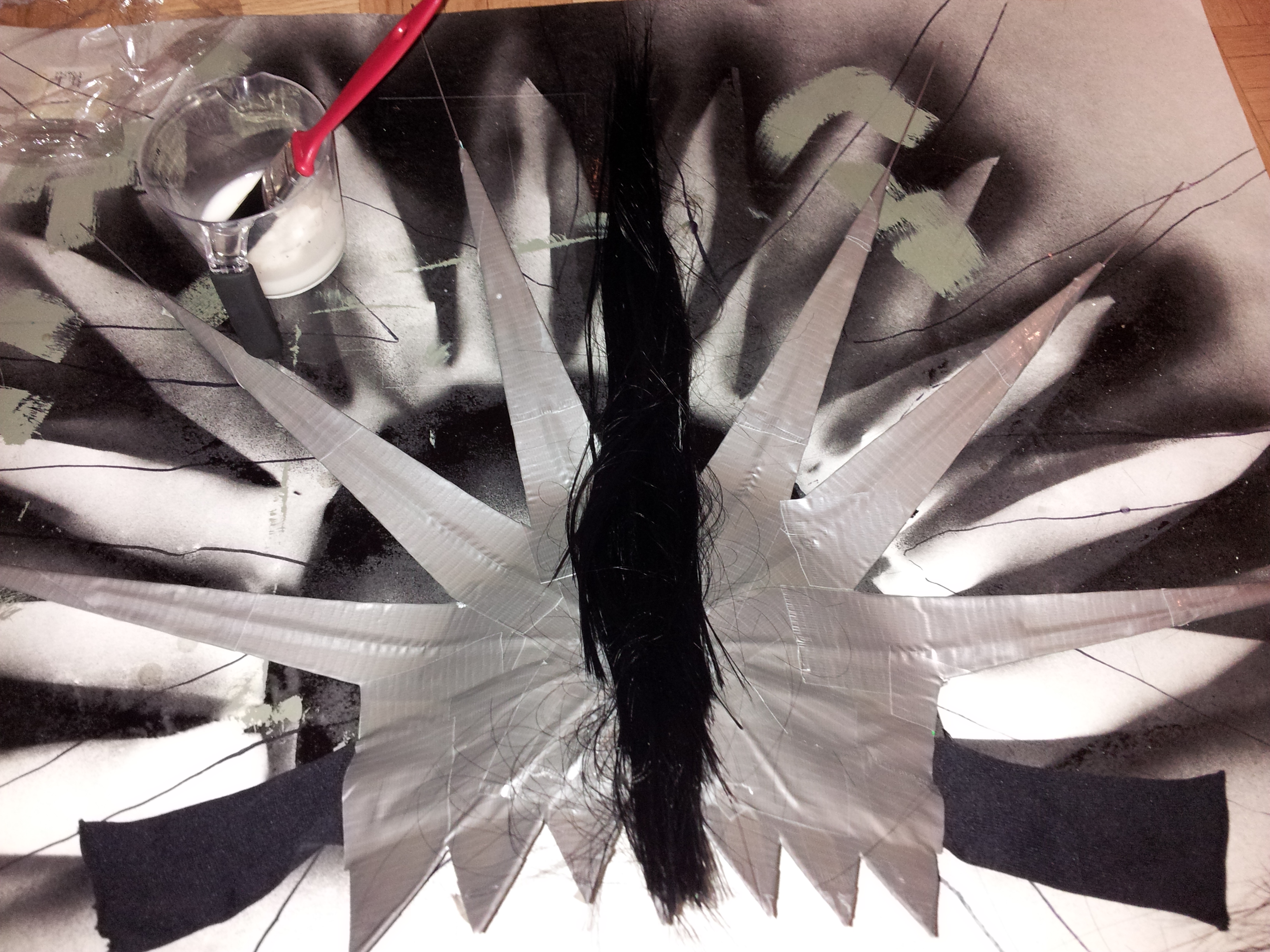 Mix 2 parts glue with 1 part water (standard paper mache mix) and paint it onto one of the spikes from hairline to tip. Place one of the sections of hair onto the glued portion of the frame and proceed to paint more glue over top of it, smoothing and shifting the hairs into place for maximum coverage with your fingers. If the hair is misbehaving and not staying where you want it, try using some of those contoured hair clips to hold it in place while you apply the glue.