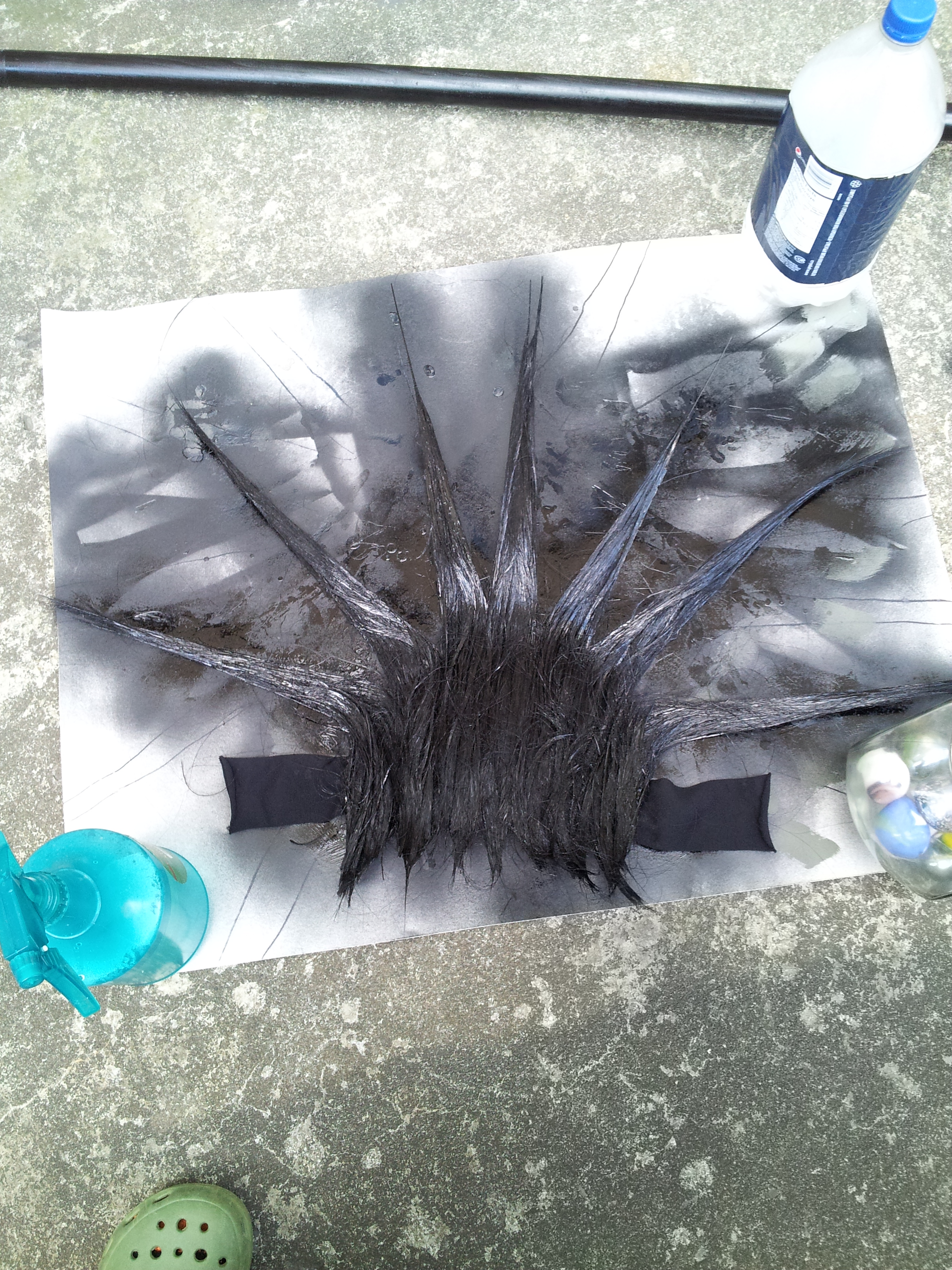 - 2-3 long straight black synthetic wigs OR 1 such wig and several wefts or wig extensions of the same colour. (Colour does not have to be an exact match but it helps. Don’t buy expensive wigs. You’re going to be ruining them after all!)