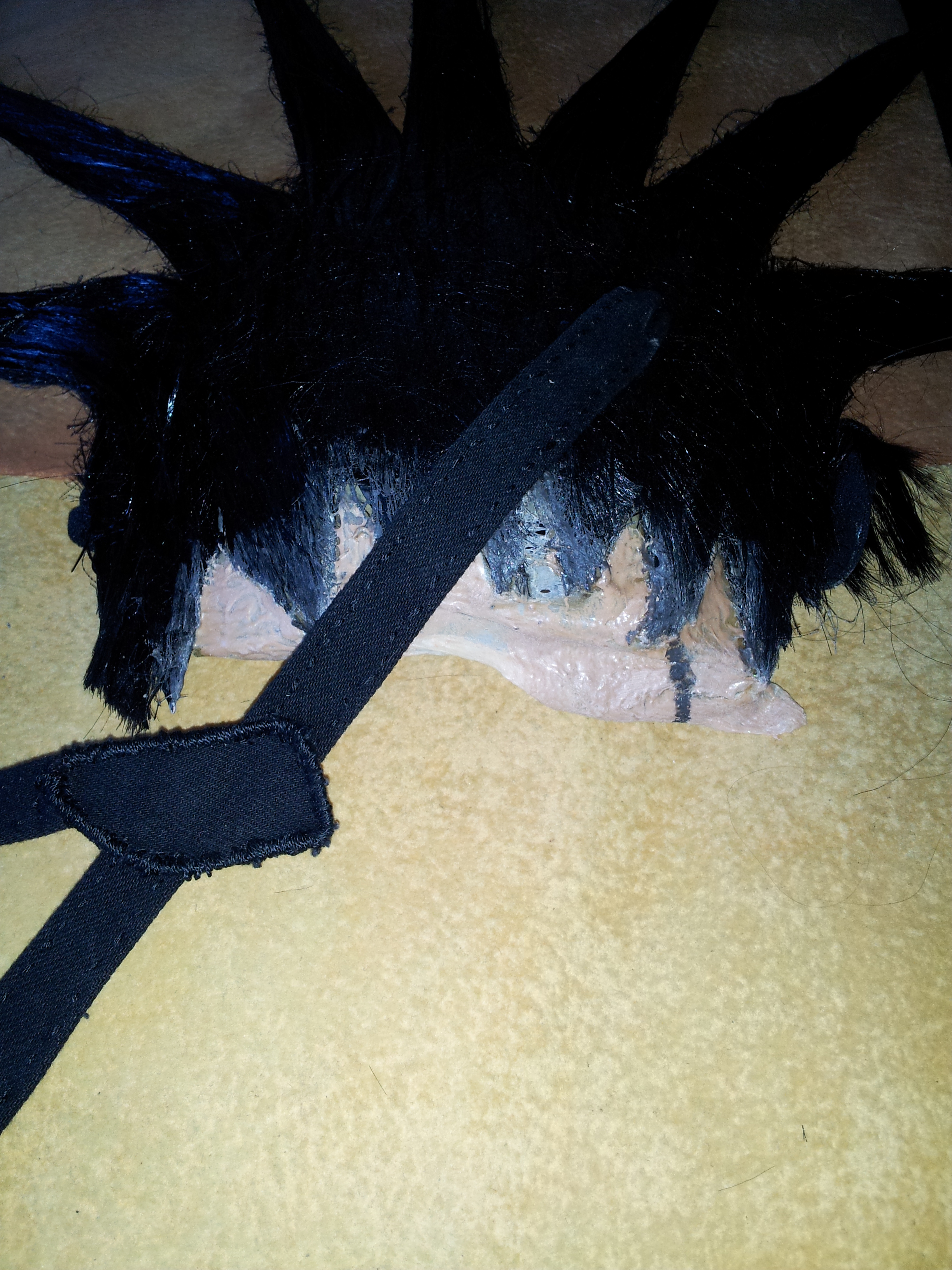 Once you’ve got the velcro sewn on the ends of the straps and everything is all nicely trimmed to the length it should be, you can poke a hole through the hair piece’s frame, being CAREFUL with the wearer’s head, and flex the scissor blades until you have a hole large enough for the top strap to fit through.