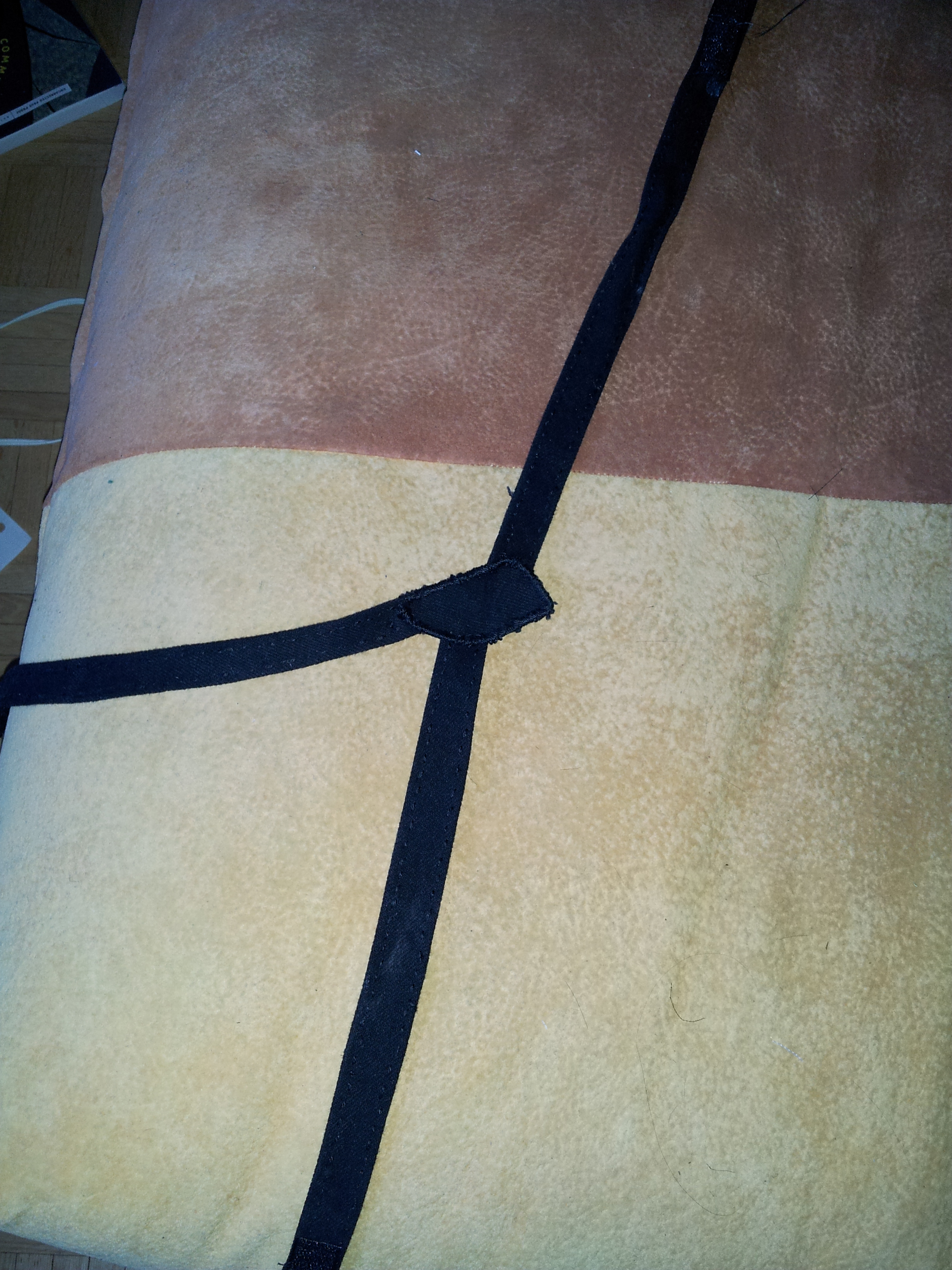 Measure around the head where the straps go diagonally around Kenpachi’s head and give yourself about 4 extra inches to work with. This is needed to accommodate the hair piece and make sure there’s enough overlap for the velcro to adhere properly. Attach the diagonal straps first, then measure around the side of the head to where they meet to make the third strap.