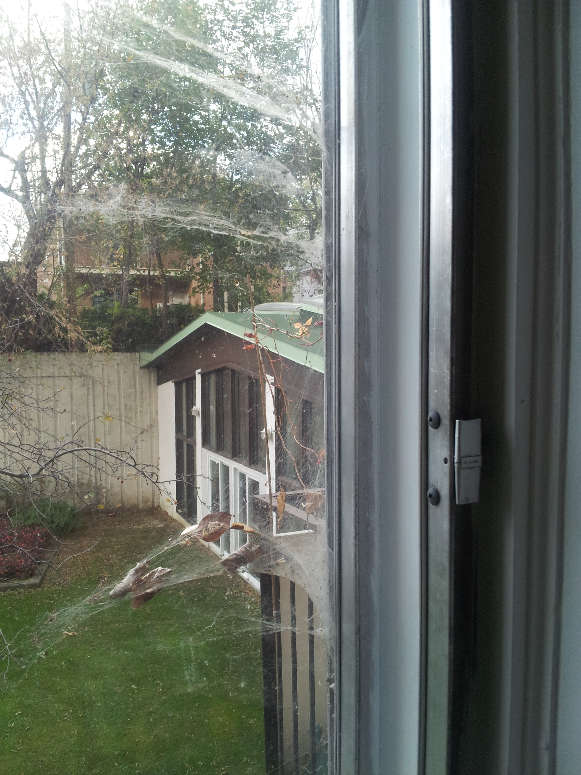 Lastly, this is not a decoration. These are honest-to-Cthulu spider webs on the outside of my kitchen window. They were made by funnel spiders which are very common in this part of Canada. Nature has presented us with perfectly good examples of the weaving done by our eight-legged friends. Why do so many people get this wrong?