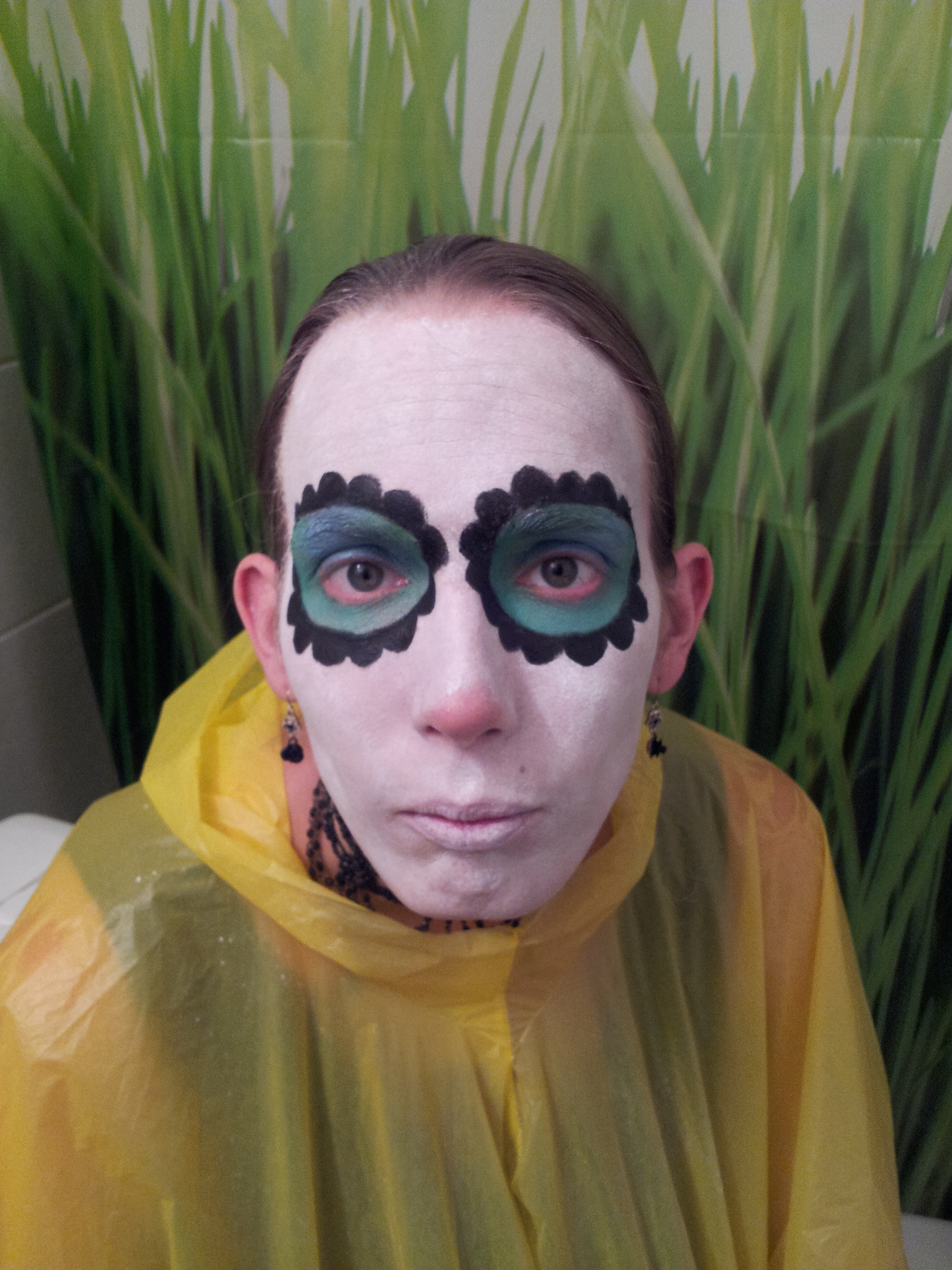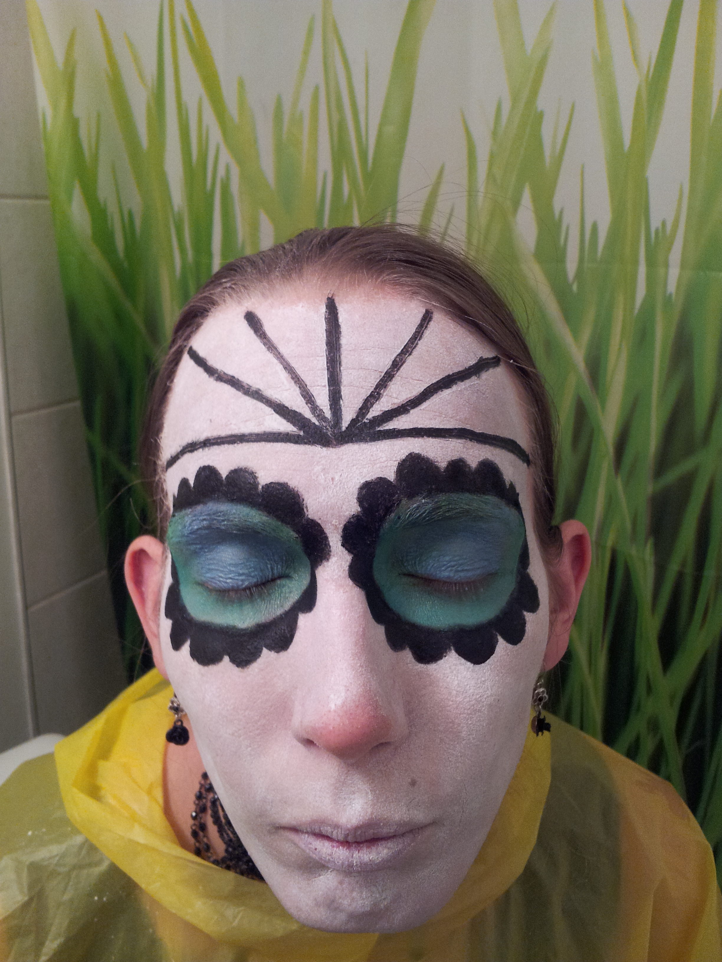 Here you can see I’ve added some dots and swirls and a depiction of a marigold on the chin. (Marigold being a traditional flower of death.) You can get nice clean dots by pressing a black eyeliner to the skin and rotating it gently a few times clockwise and counterclockwise. I used a small round brush for the swirl details.