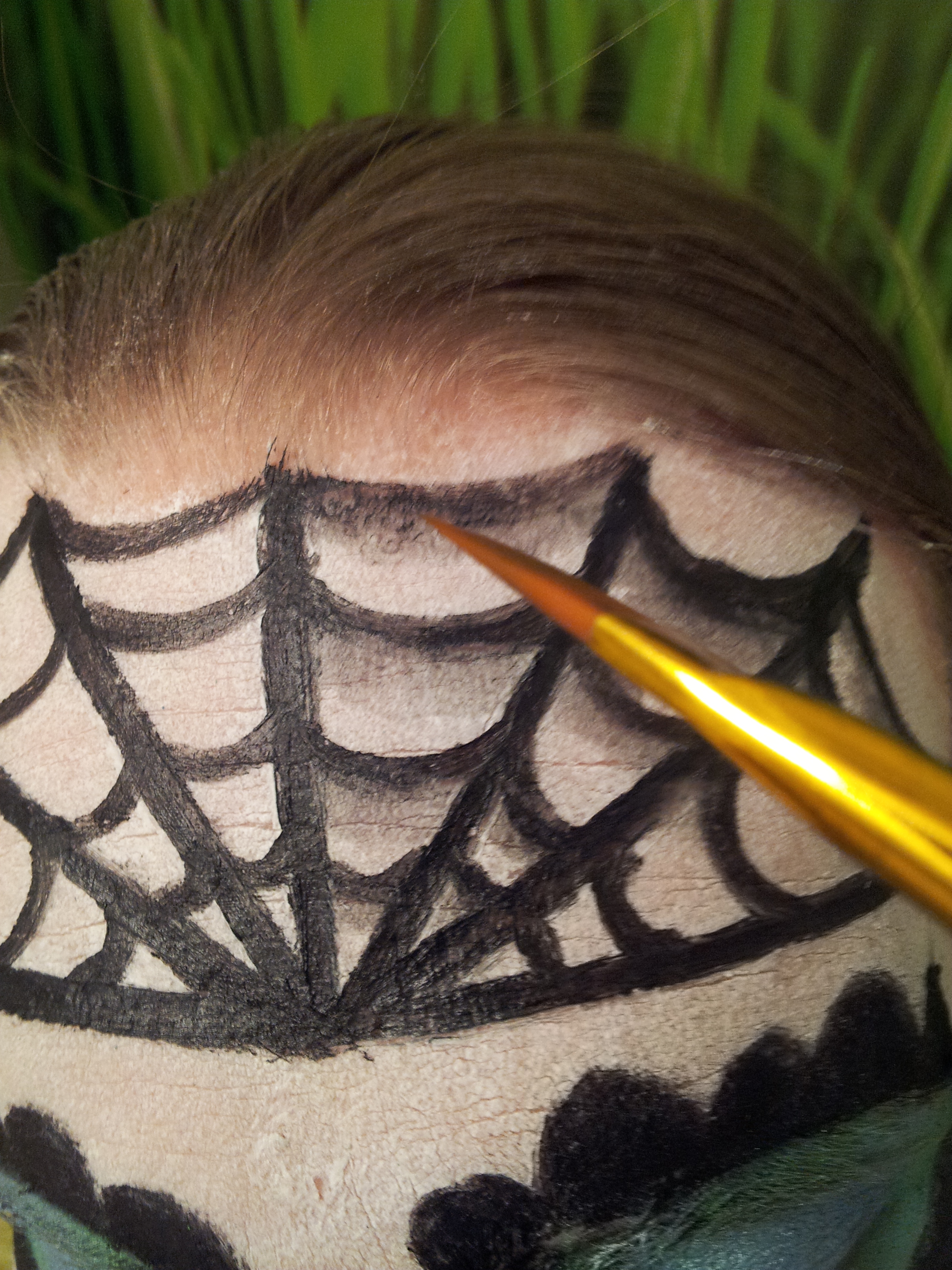 Note: it’s not necessary to paint a spider web here. It’s just a very popular design and it enhances the look of the veil if you’re wearing one.