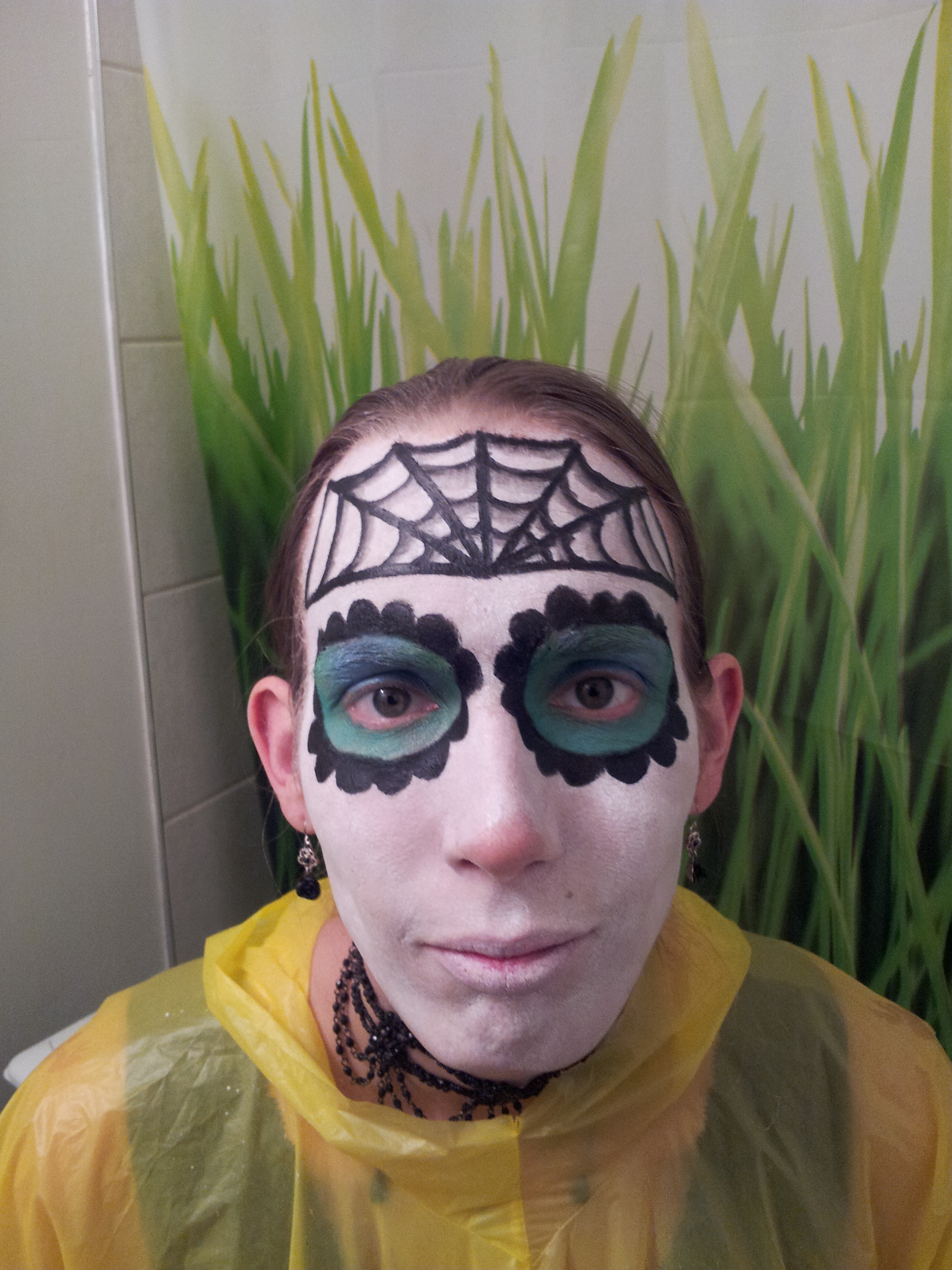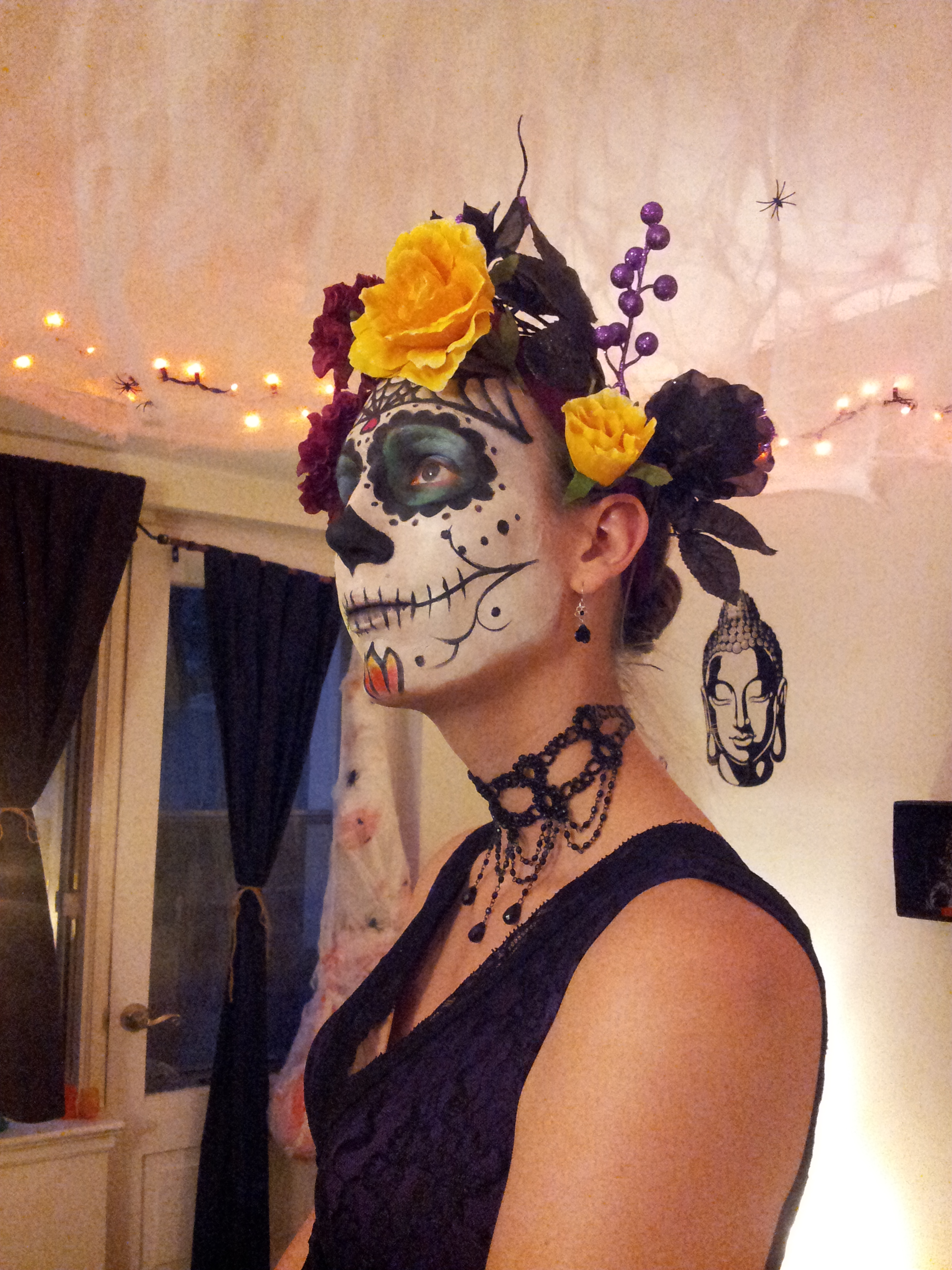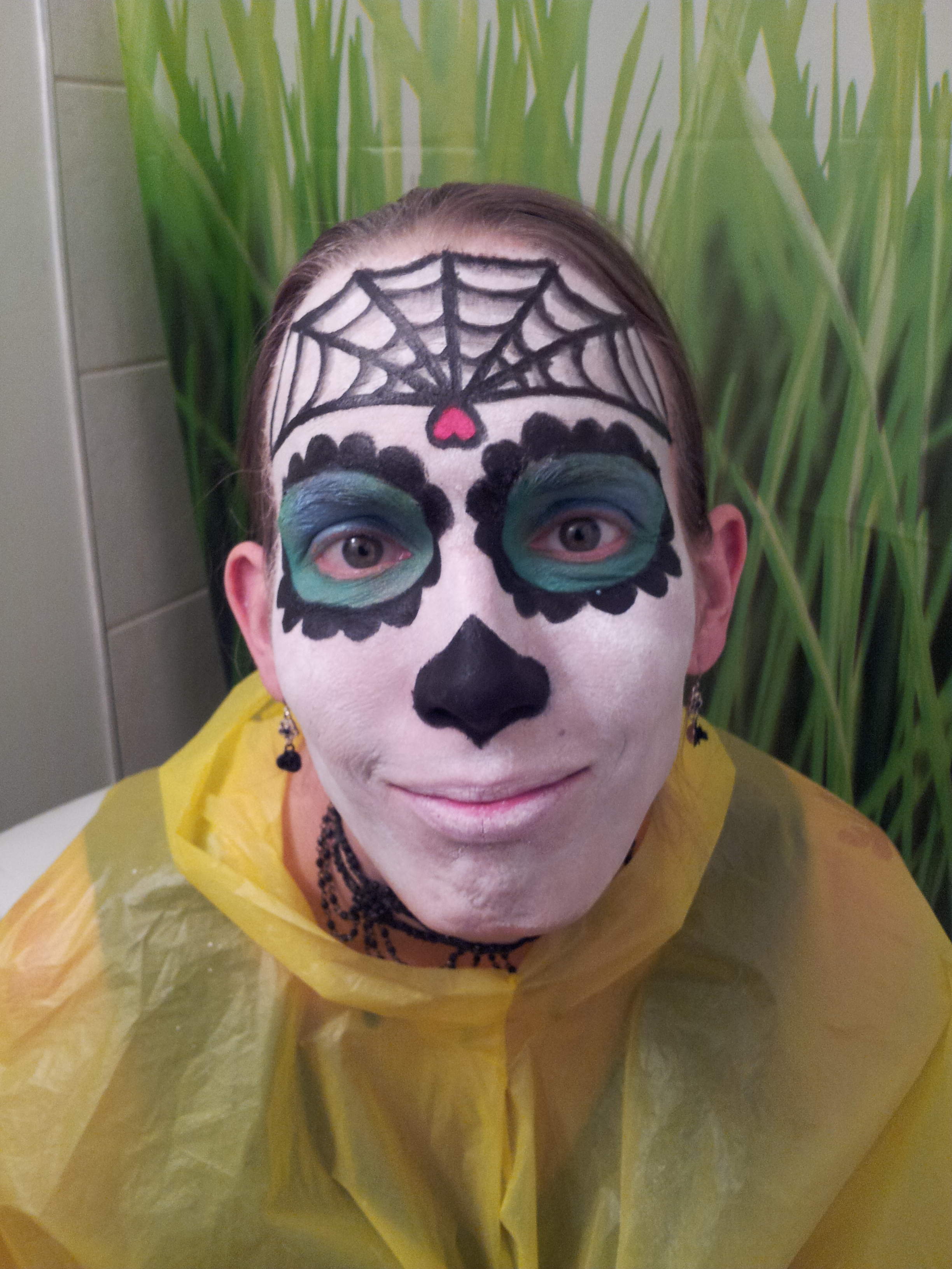 Hi guys! I had a lovely Samhain party this weekend and, as I organize the photographs, I’ll present them here for you to make use of if you so desire. First on the list, because I’ve been poked by everyone who’s seen it so far, is a post on the sugar skull makeup I did on my wife.