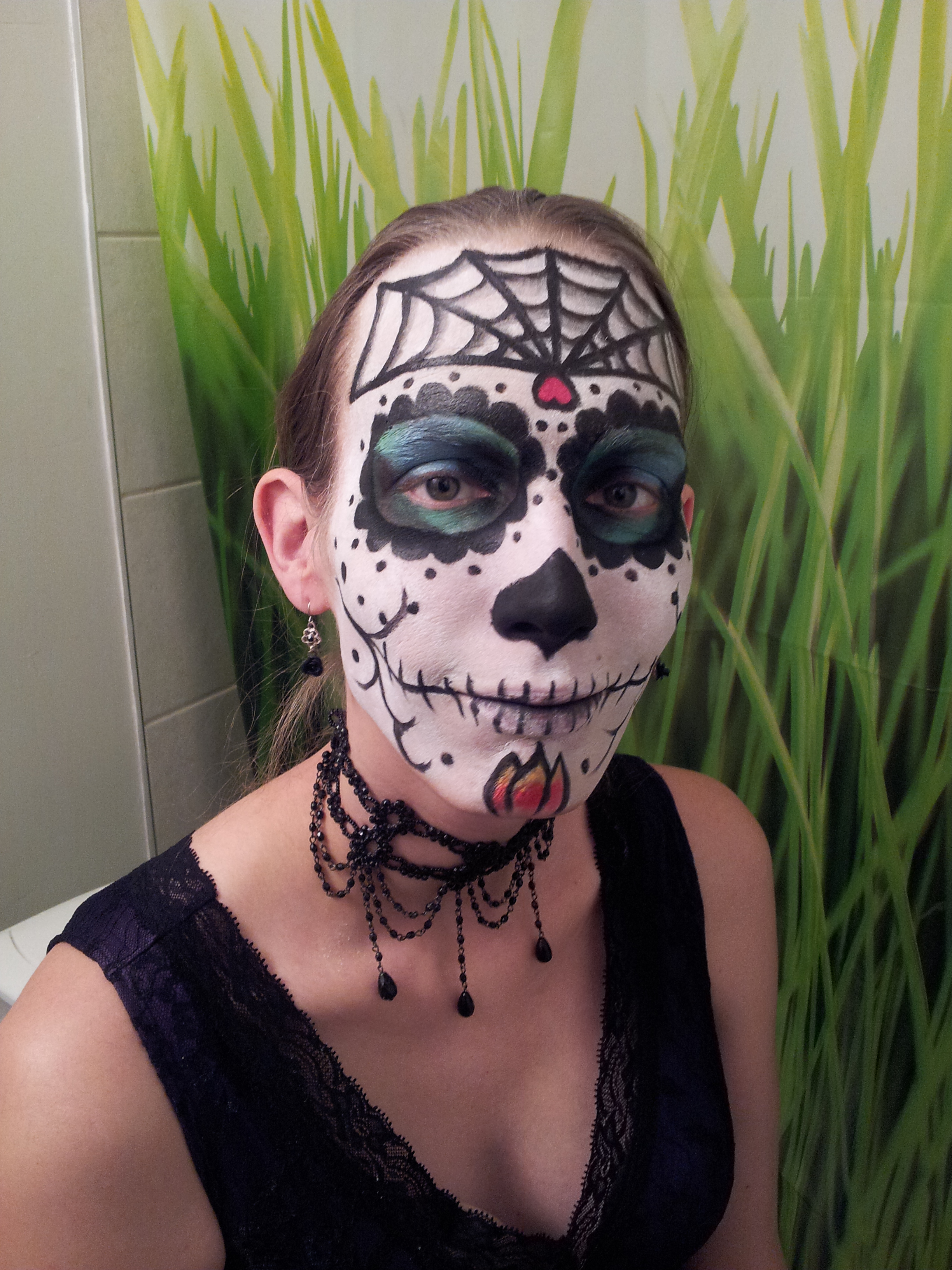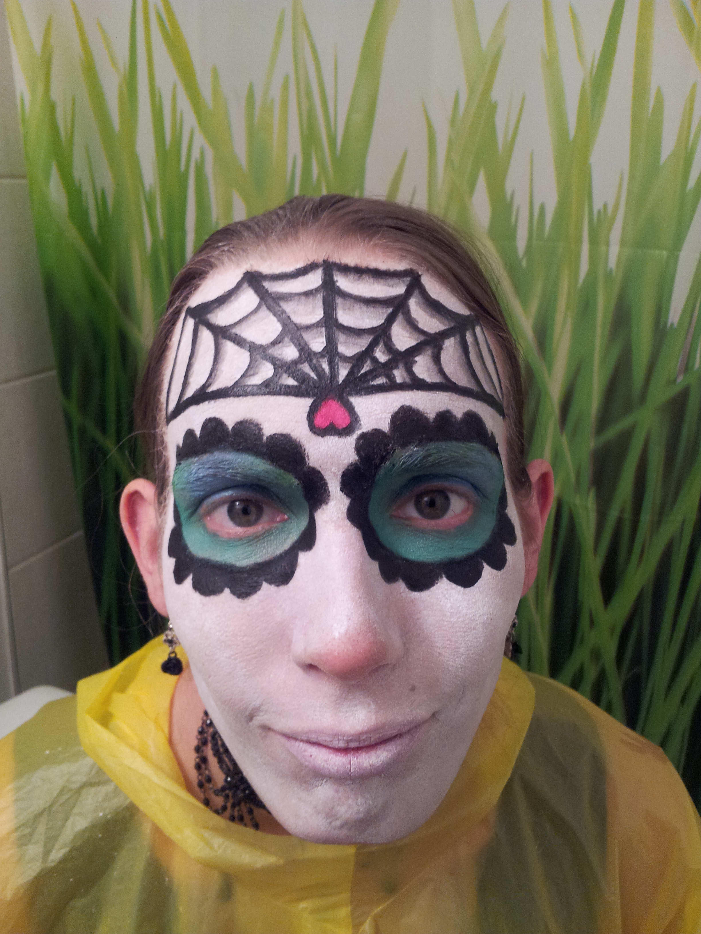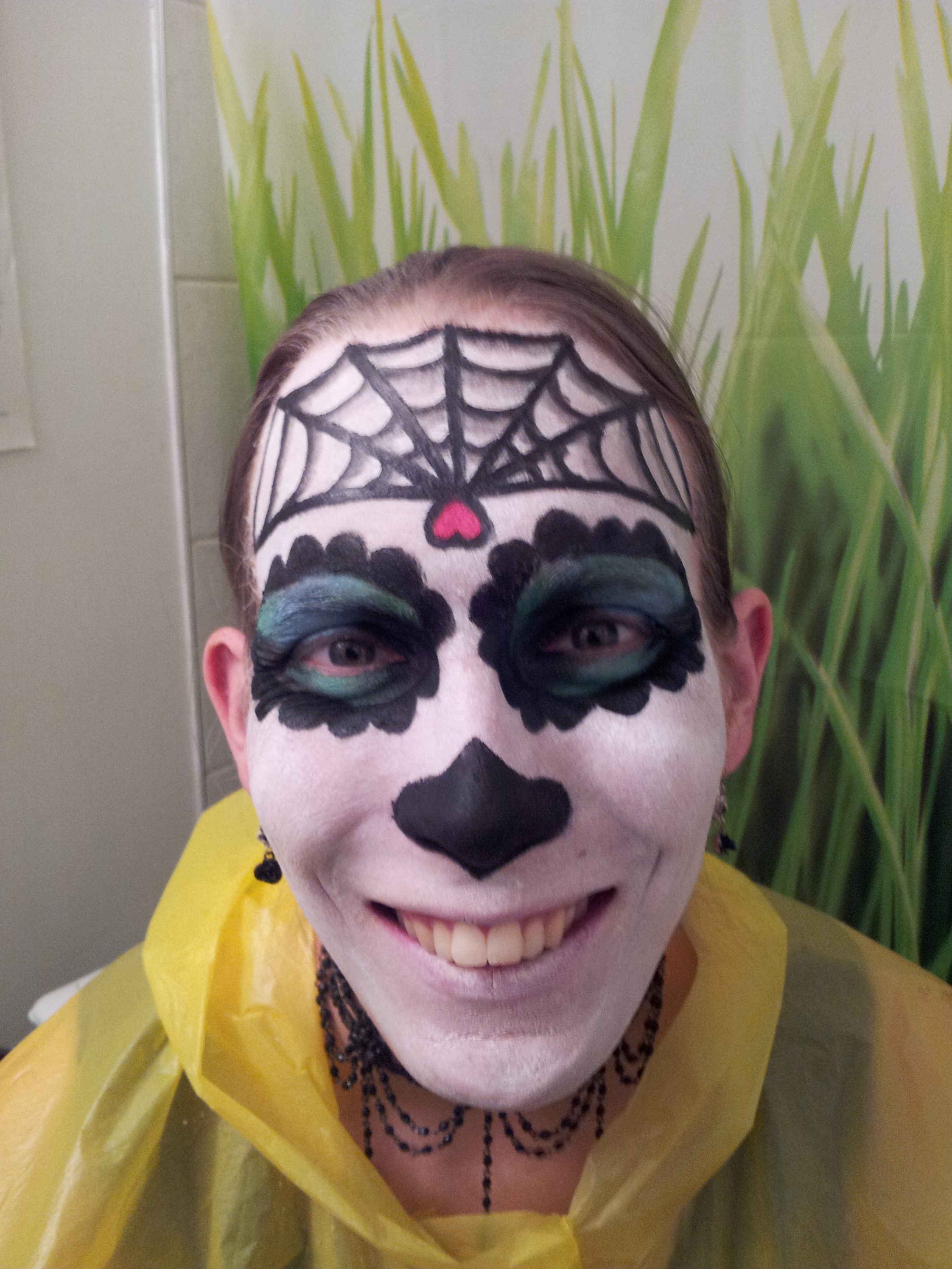 I’d like to share with you the youtube videos that taught me how to do this. I think you’ll find them helpful. There are many ways to do a sugar skull and they can be as simple or ornate as you like. Just make sure to get enough of the key elements together so people know what they’re looking at. The white face, flower eyes, black nose, and skeleton teeth are the bare essentials for pulling off this look. Any less and you may wind up looking like just a plain skull, a clown, or some kind of flower-eyed puppy.