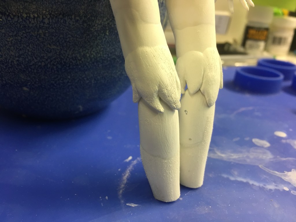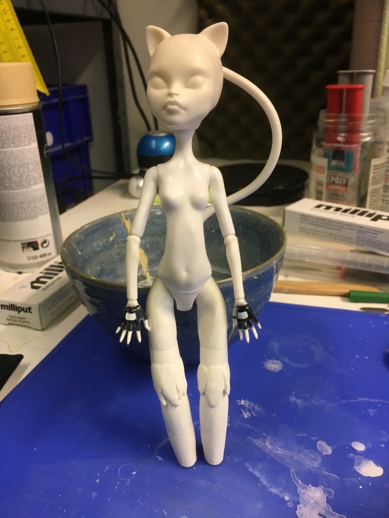 I’m also continuing work on my cat girl doll. You might remember that she came to me with a broken leg. I re-designed her knee joints to make them stronger (using metal instead of plastic). However, the new joints, though strong and very flexible, are rather ugly. So I tried to cover them with some fur-textured epoxy paste.